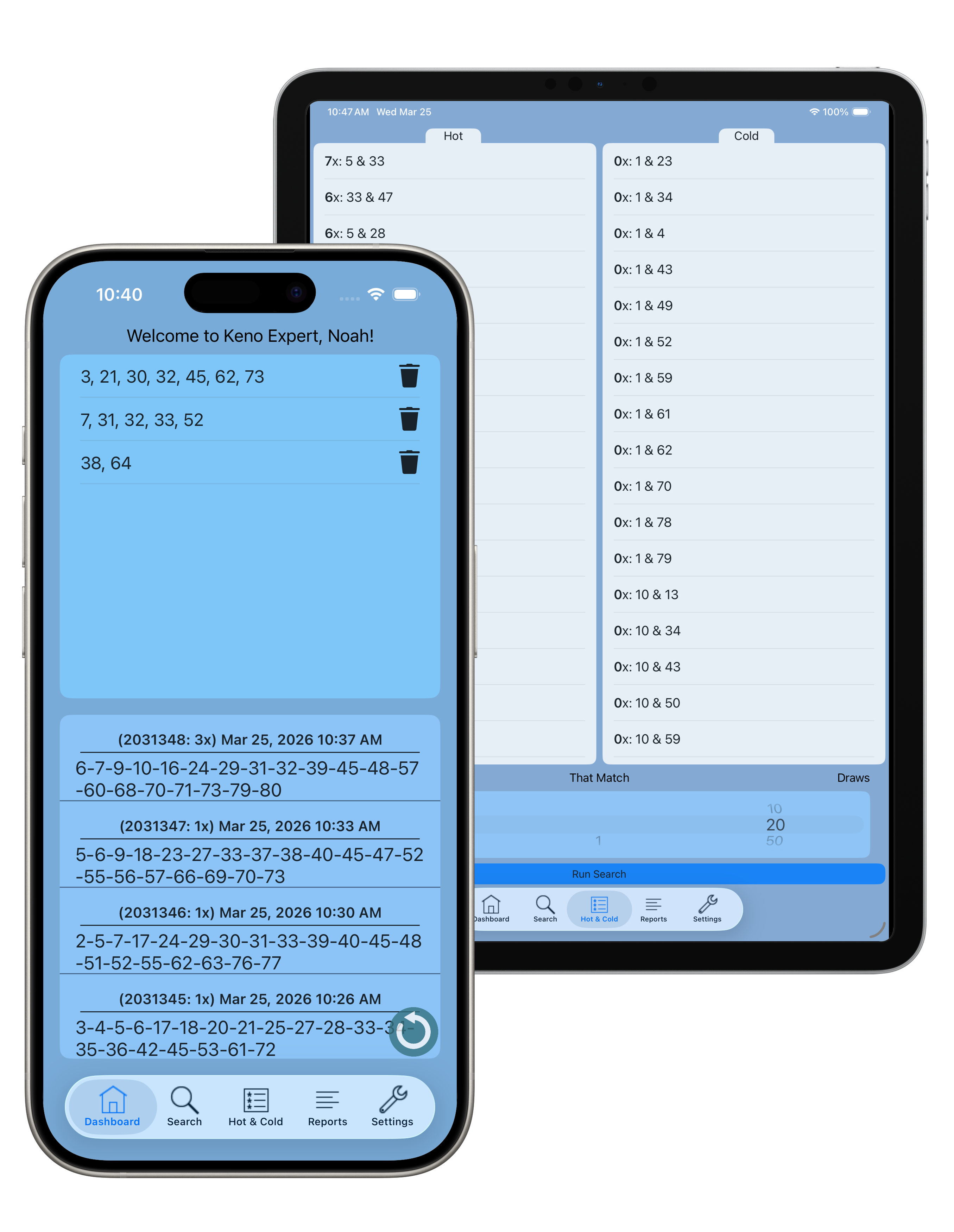 To help customize your experience, the app provides a Dashboard where you can save your favorite searches for quick access. When you run a search on your favorite numbers, Keno Expert will tell you the last time your numbers hit, the draw number, and the booster. Then you can decide if you want to play those numbers! If your numbers aren't feeling lucky, use other features to determine what you want to play, such as Hold and Cold numbers or Reports.